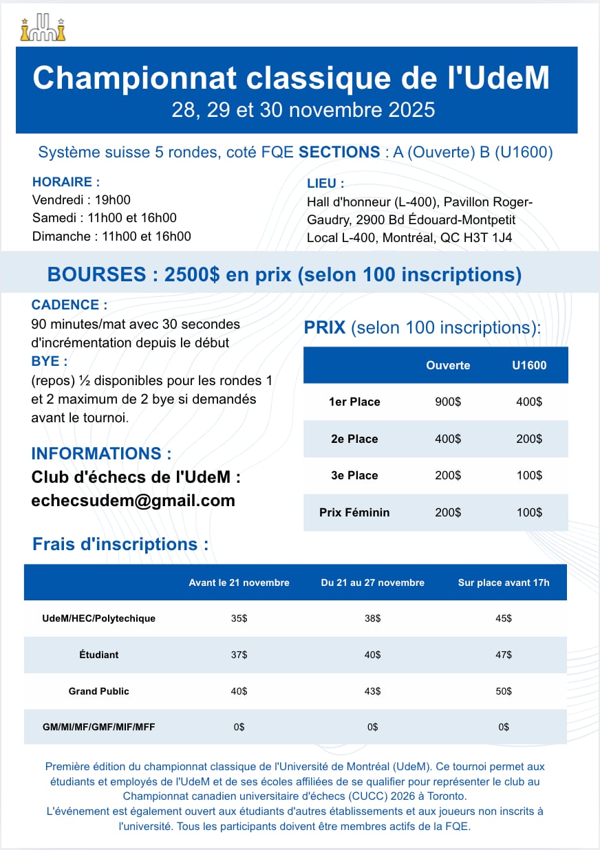 Première édition du championnat classique de l’Université de Montréal (UdeM). Ce tournoi permet aux étudiants et employés de l’UdeM et de ses écoles affiliées de se qualifier pour représenter le club au Championnat canadien universitaire d’échecs (CUCC) 2026 à Toronto.